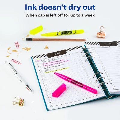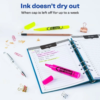 HI-LITER Desk Style Highlighter with brilliant read-through fluorescent yellow and pink colors and a durable plastic chisel tip won’t fray or mush. HI-LITER Assorted desk style highlighter features chisel tip that does not fray or mush. Highlighter has durable plastic tip for smooth highlighting. The original highlighter with brilliant read-through colors and a molded chisel tip to highlight or underline. Durable plastic tip for smooth highlighting—won’t fray or “mush. Formula allows you to leave cap off for up to one week and still highlight. Quick-drying ink. Sold as 24/Box.