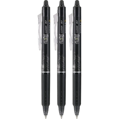 Get the smooth writing of a pen with the convenient erasing of a pencil from this 3-pack of Pilot FriXion fine-point ball clicker erasable black gel pens. Complete crossword puzzles, do math or edit papers with these Pilot FriXion Ball Clicker erasable gel pens. The fine tip keeps your writing sharp, while the erasable gel ink lets you fix mistakes as you go. These Pilot FriXion Ball Clicker erasable gel pens come in a pack of three so you always have a spare. Erasable gel pens allow you to write, erase, and rewrite with no wear-and-tear. Black ink has a rich color for excellent readability. Fine 0.7mm tip ensures crisp lines with every use. Black barrel. Three pens per pack. Comfort grip for superior control. Features a pocket clip for convenient carrying. Refillable ink allows pens to be reused instead of being replaced to save money. Sold as 3/Pack.