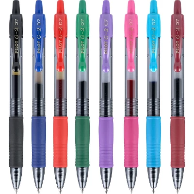 Create vibrant presentations with this 8-pack of Pilot G2 premium assorted-color fine-point retractable gel roller pens. Make your writing stand out with these Pilot G2 premium retractable gel roller pens. These pens feature a fine point, so you can produce sharp, clear lines with each stroke, while their plastic clips make them convenient to carry in a shirt pocket for quick access. These Pilot G2 premium retractable gel roller pens have eight assorted colors, letting you create dynamic presentations. Retractable gel pens for everyday writing tasks. Assorted colors for a variety of tasks. Fine 0.7mm tip ensures crisp lines with every use. Assorted colors barrels. Eight pens per pack. Comfort grip for superior control. Features a pocket clip for convenient carrying. Refillable ink allows pens to be reused instead of being replaced to save money. . Comfortable and Functional. With a flexible ergonomic grip, these pens make taking notes a comfortable experience. Their easy open, retractable pen tips prevent the pens from drying out. Very long lasting, their transparent barrel makes it easy to tell when it’s time to restock, helping to ensure that you’re never left without a working pen. . Brilliant Array of Colors. Sold in a pack of eight unique shades, these pens offer a range of brilliant, rich gel colors. From classic black, blue and dark red to fun and fresh pink, purple and baby blue, this set contains the perfect color for just about any occasion. Use them to color code your notes to make exam prep a breeze. The lighter shades stand out well when paired with dark paper and are great for making homemade cards and crafts. . High Quality, Ultra-Smooth Writing. With an ultra-fine 0.7 mm writing point, these pens are perfect for creating sharp, clear lines. Their quick drying ink helps to prevent bleeding and smudging while still providing a rich, full hue and smooth penmanship. . . Sold as 8/Pack.
